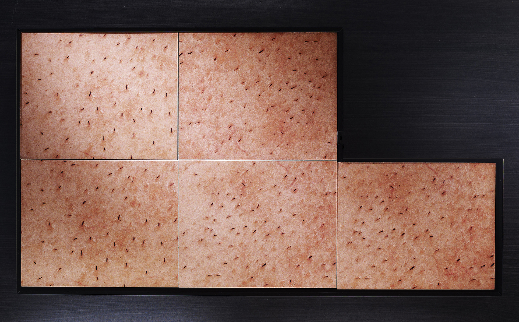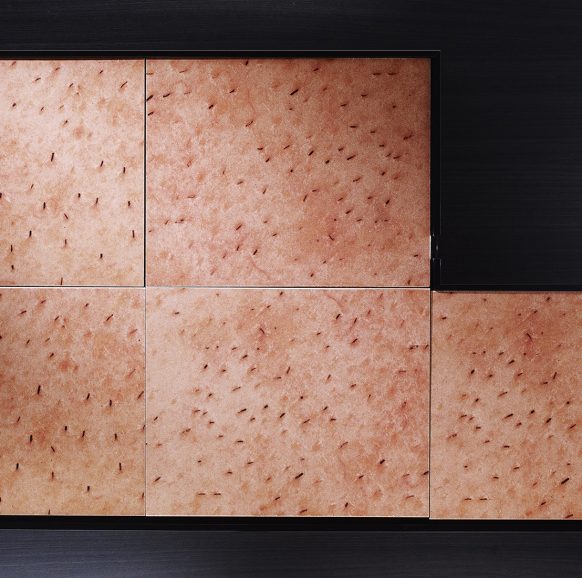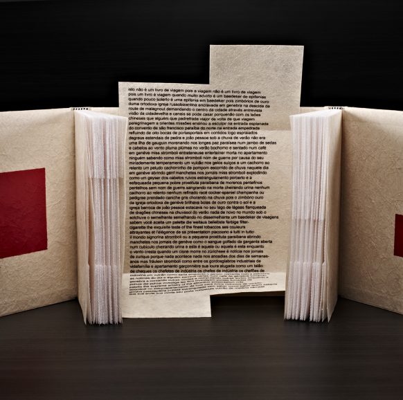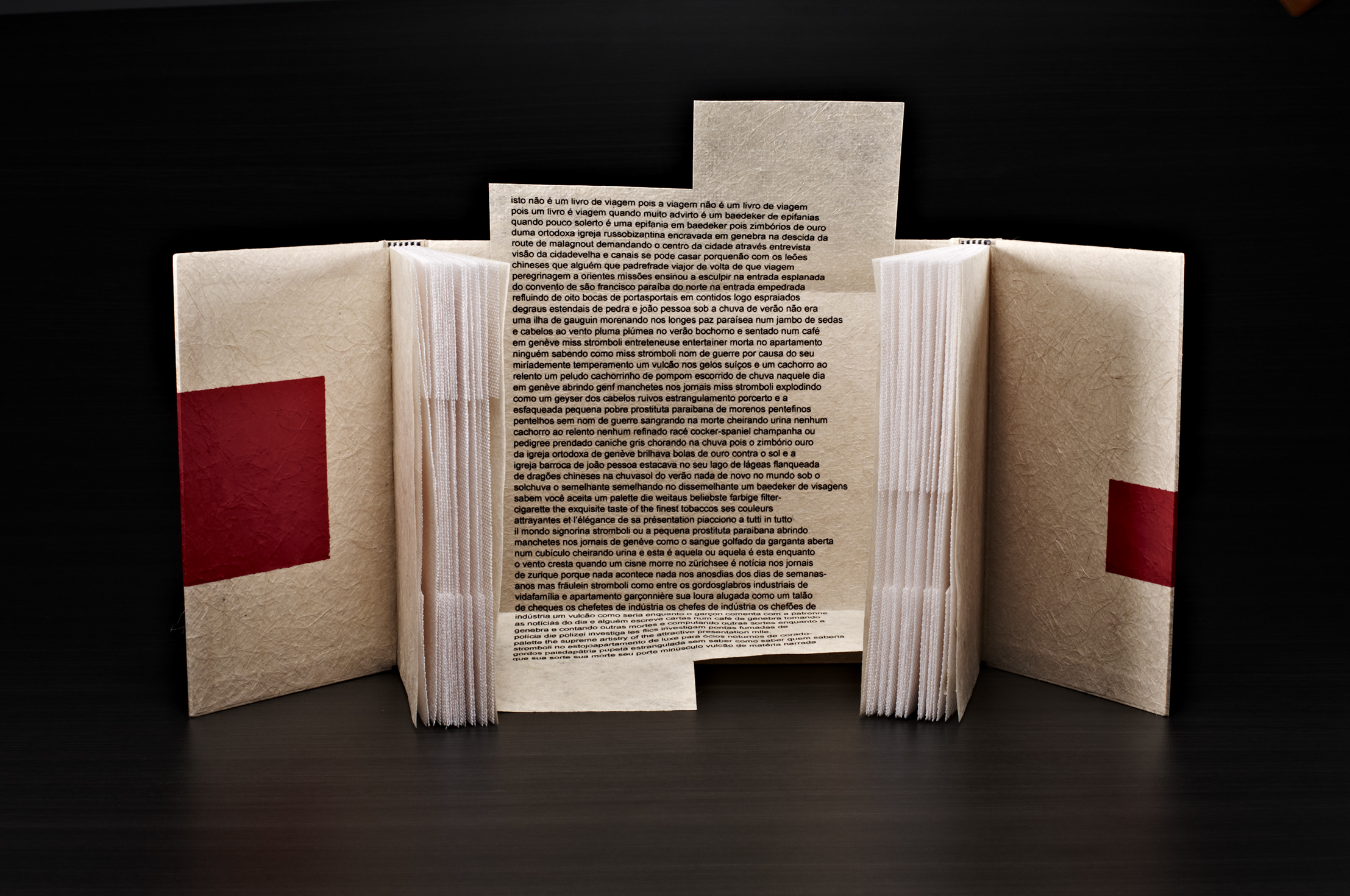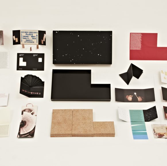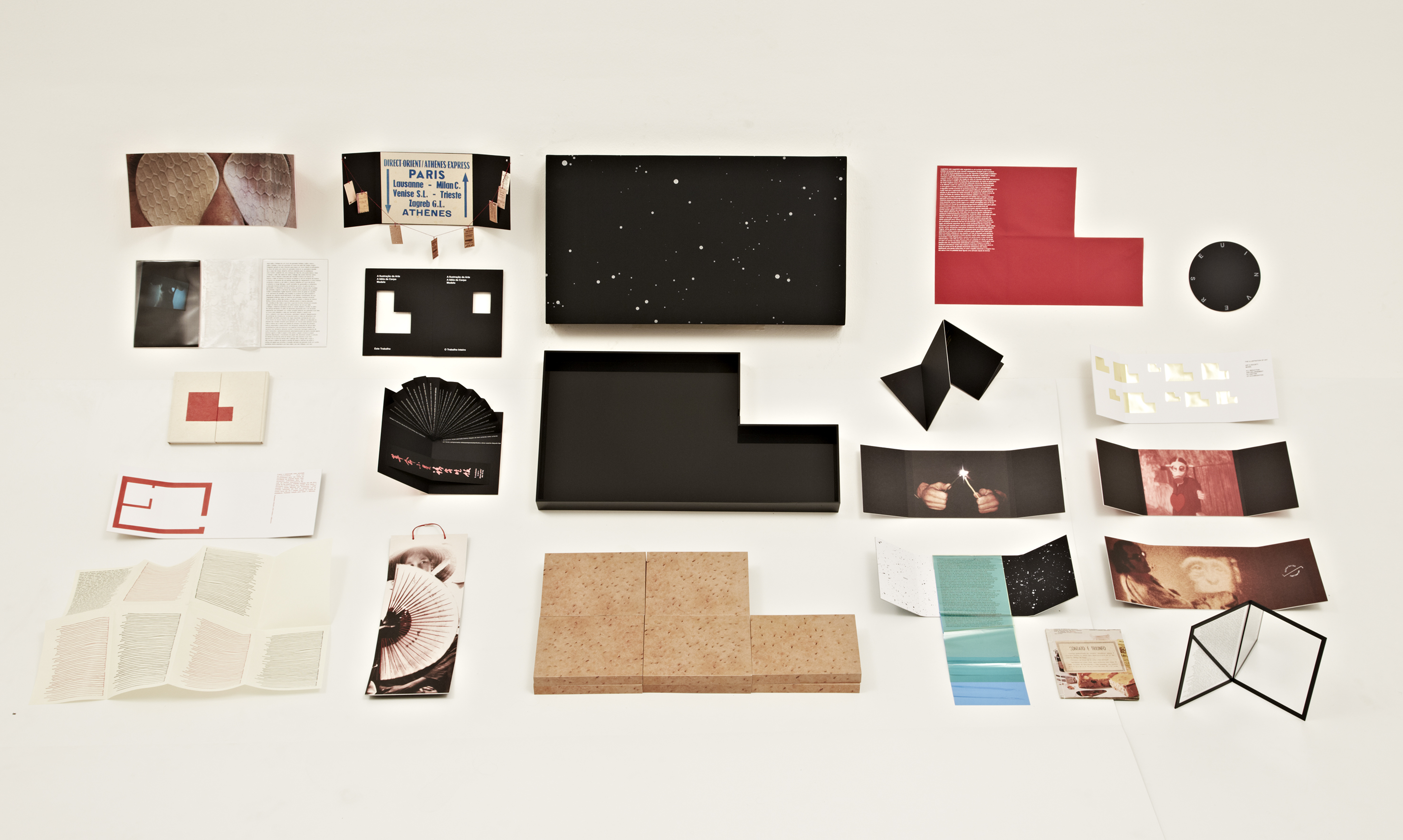 a fiberglass case covered in fabric with 32 graphic works, grouped and enclosed in 10 wooden boxes