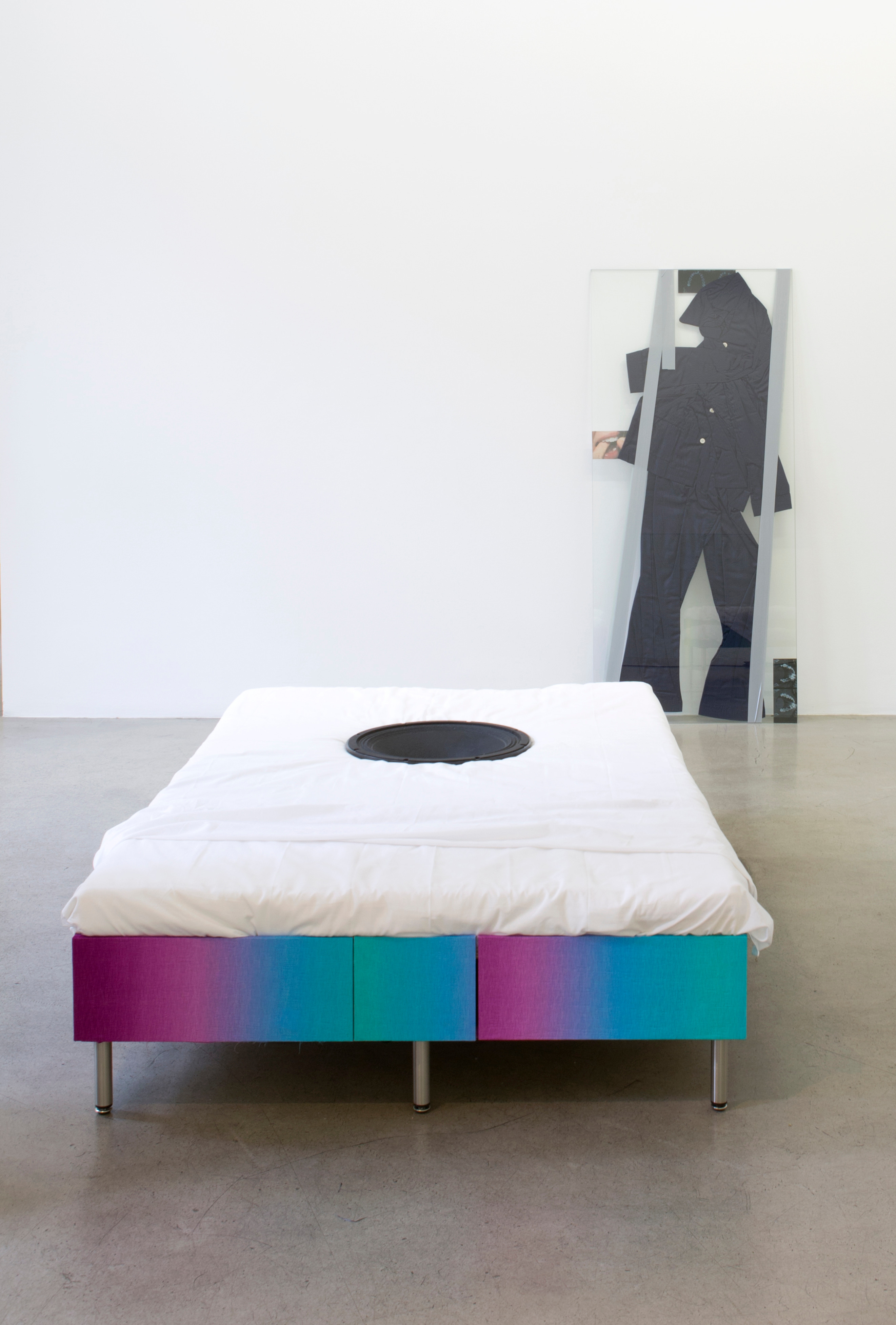 Bed, sheets, speaker, amplifier, CD player, looped audio (melody)