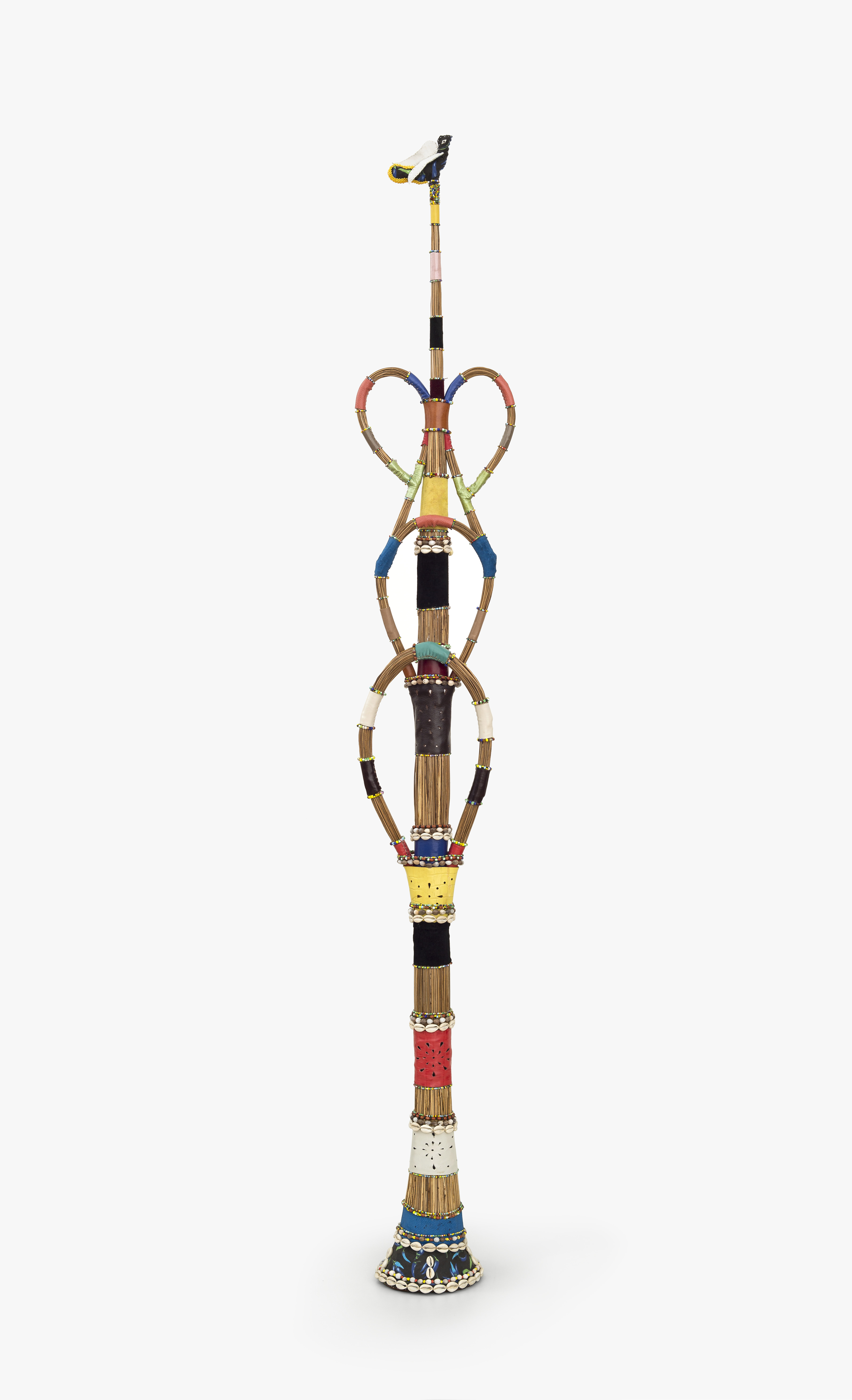 Straw, painted leather and colored beads