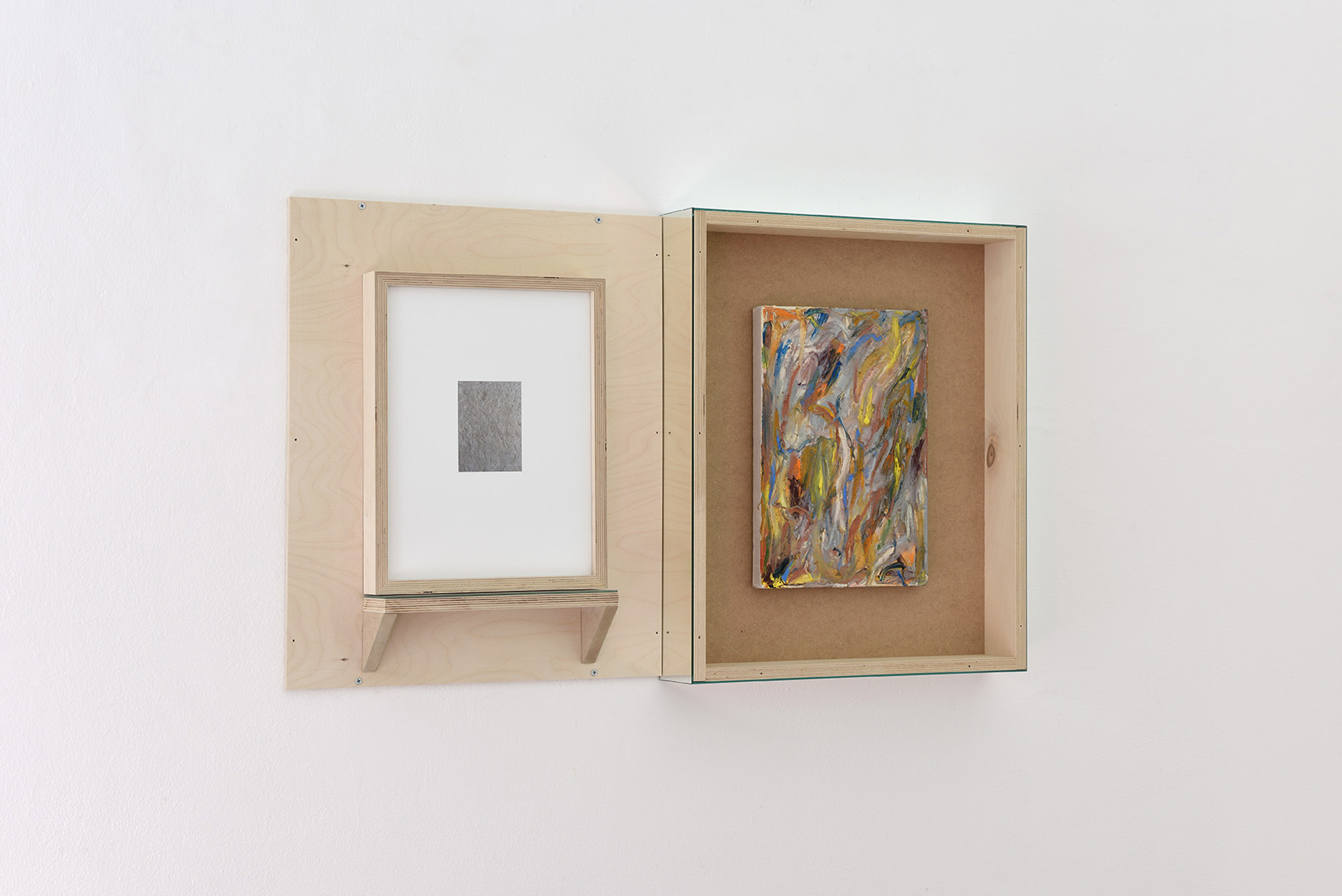 oil on linen canvas, medium density crate and mirror, 35mm photograph, print on 100% cotton paper, medium density frame and shelf