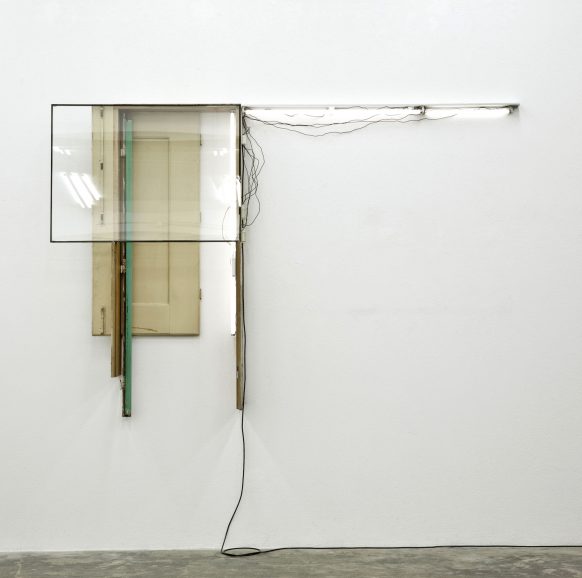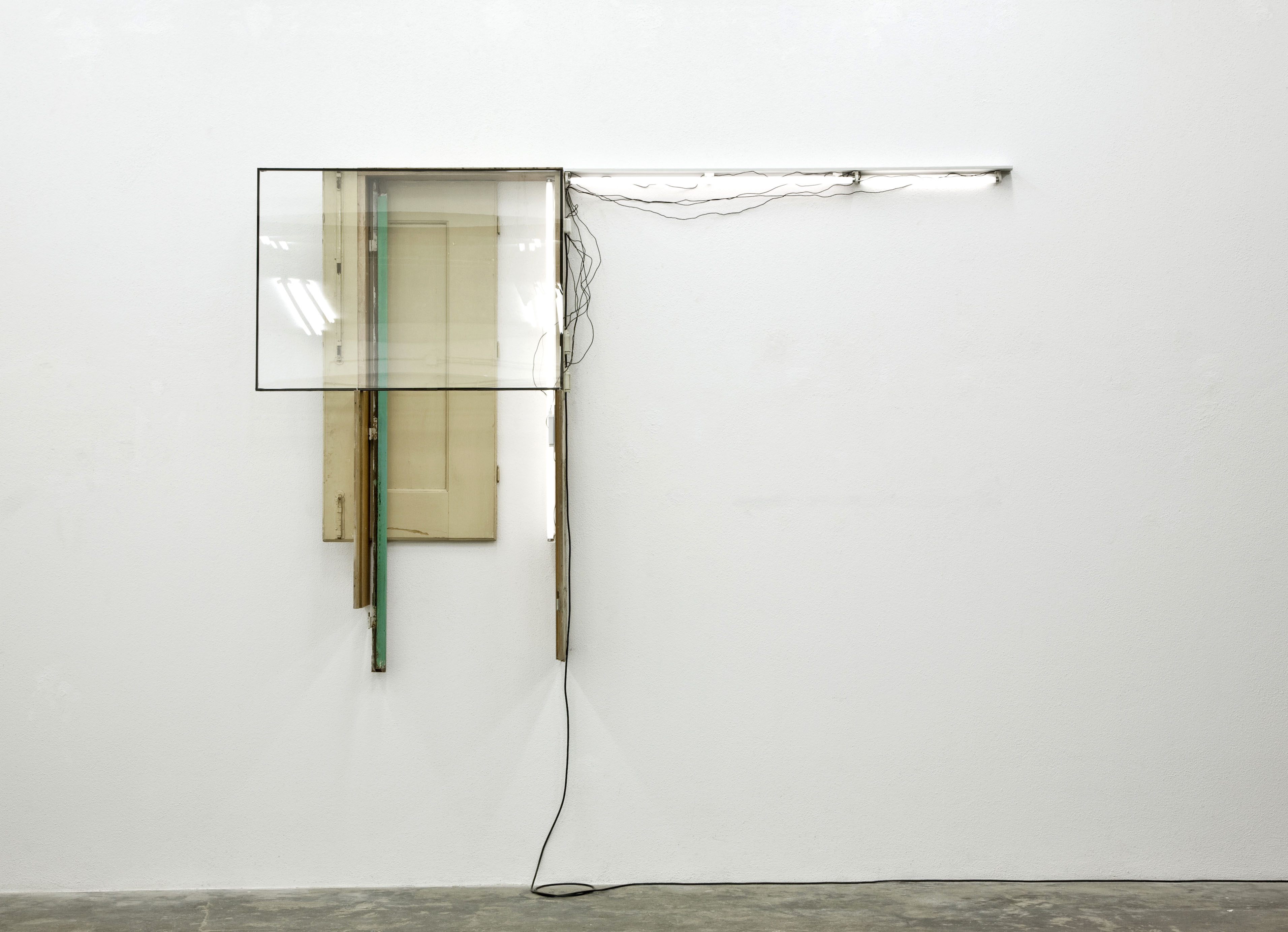 glass, aluminium, acrylic on wood, found wood objects, armatures, fluorescent lamps, electric cables