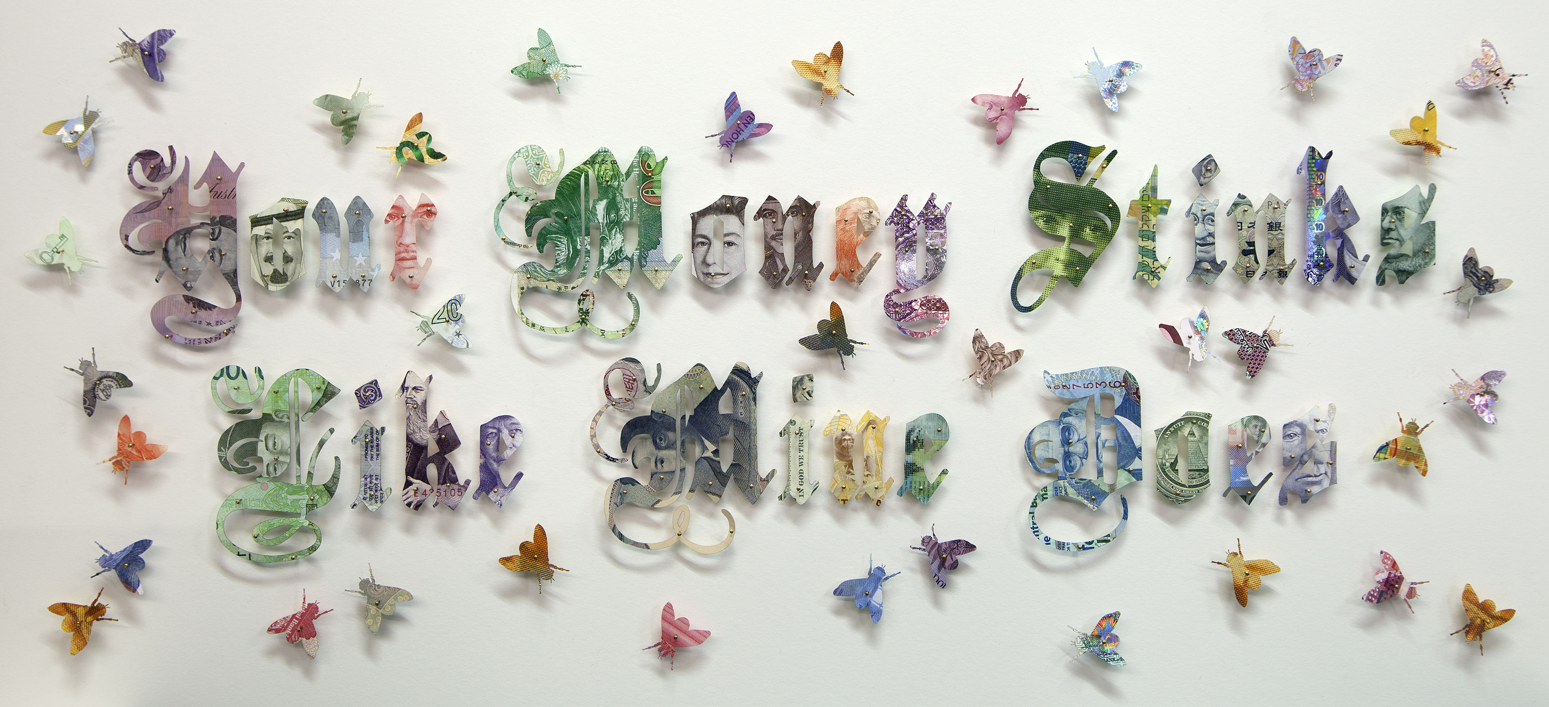 Original banknotes, parpastu, Golden pins, wooden frame with gold leaf and antireflective museum glass.
